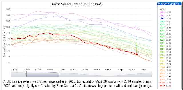 Arctic sea ice extent was rather large earlier in 2020, but extent on April 26 was only in 2016 smaller than in 2020, and only slightly so.